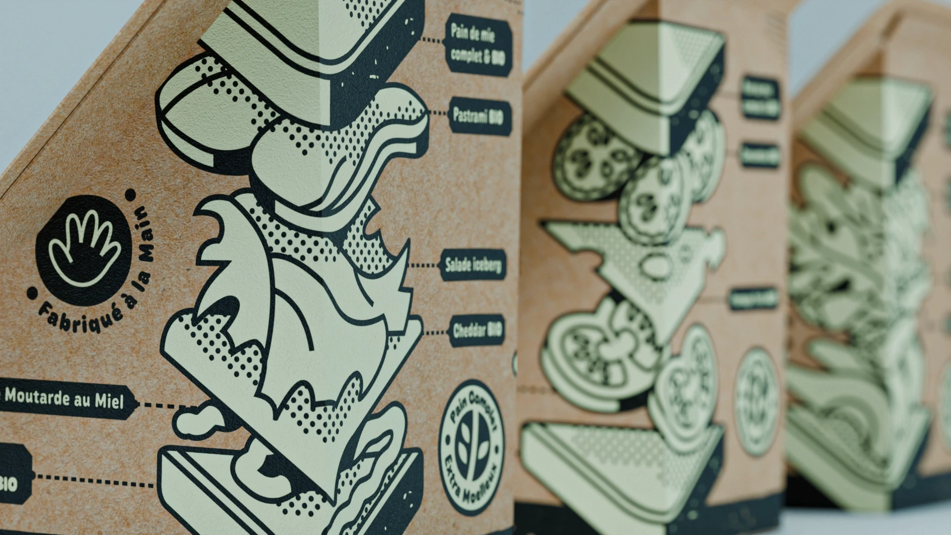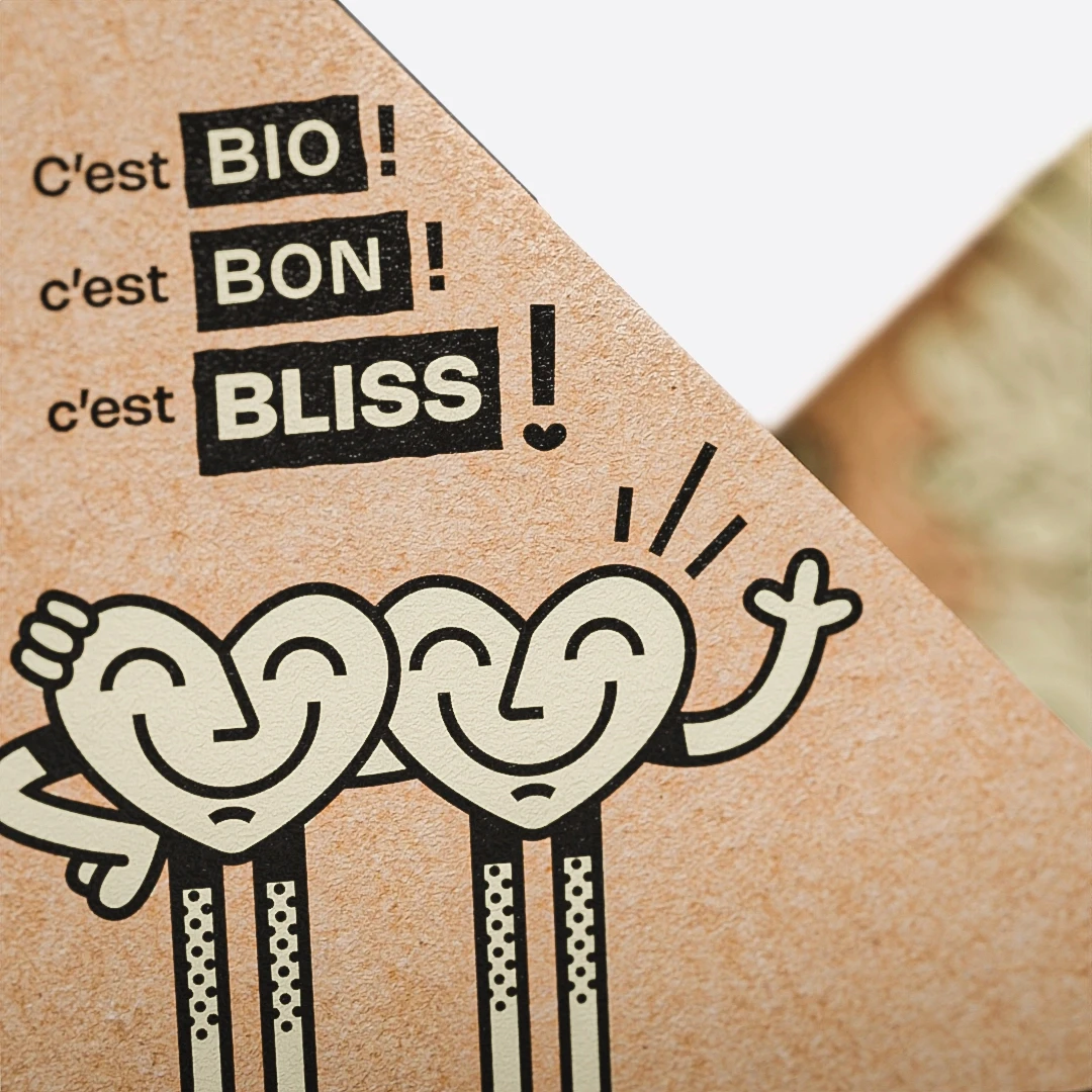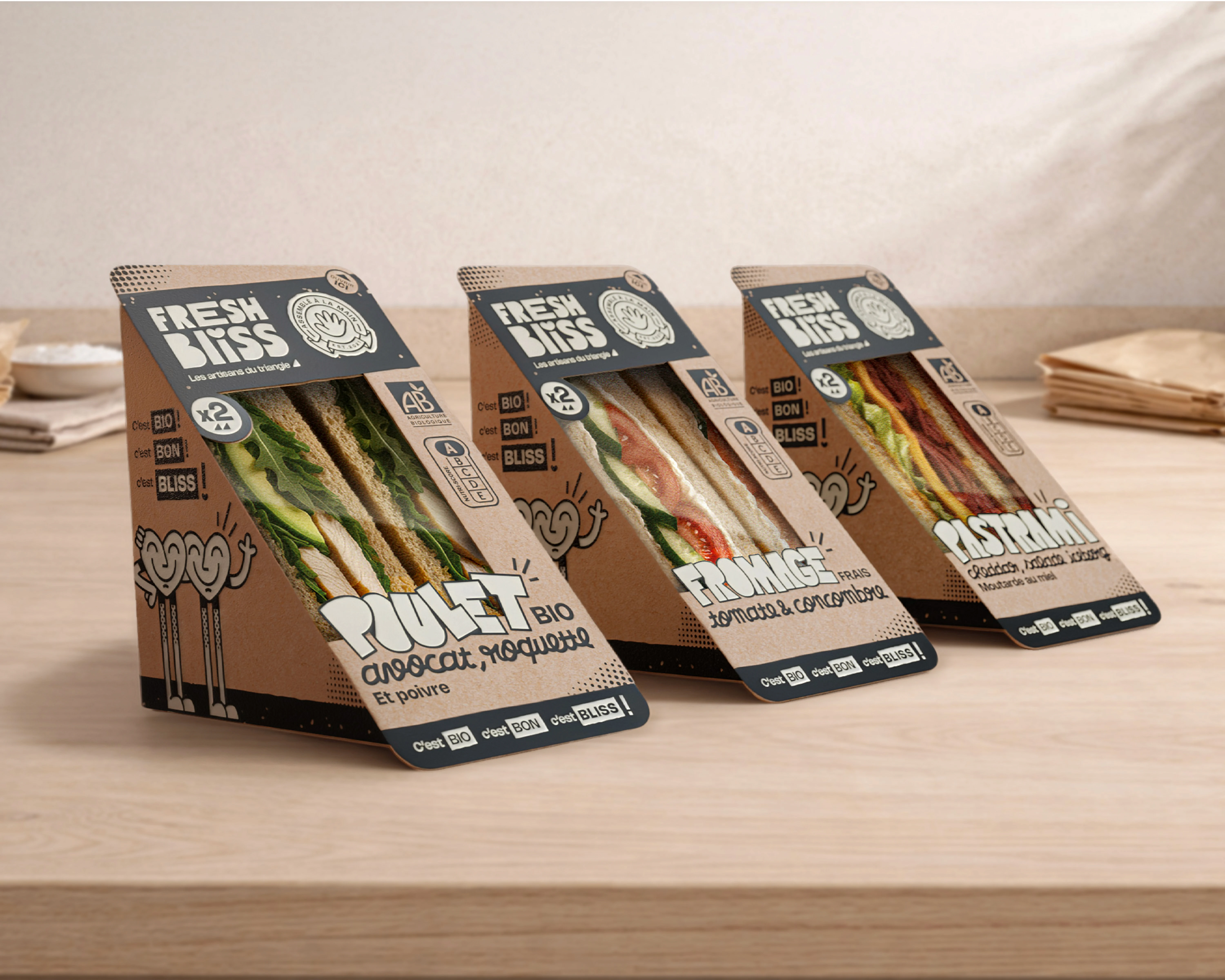 C’est bon, c’est bio, c’est Bliss ! Tel est le slogan que j’ai imaginé pour accompagner l’univers de marque. Fresh Bliss est une nouvelle marque de sandwichs préparés à la main et bio. Loin des mauvais souvenirs d’aires d’autoroute et de leurs sandwichs triangles spongieux à la garniture plus que timide, Fresh Bliss propose de véritables sandwichs généreux, préparés à la main avec des ingrédients de qualité issus de l’agriculture biologique. Mon rôle dans ce projet a été de créer l’univers graphique d’une marque à la fois gourmande, généreuse et éco-responsable. J’ai conçu un logo amical et un packaging à la fois appétissant et ludique, décliné en trois saveurs différentes.